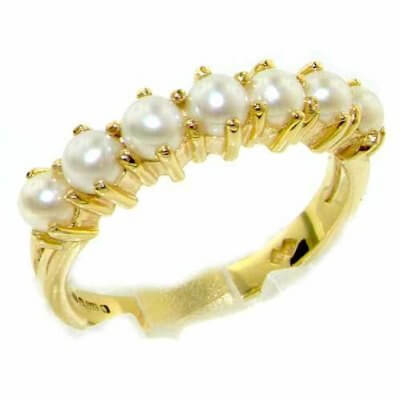 A beautiful Pearl Half Eternity Ring set with seven 3mm (0.12″ inches) Pearls in a dainty 9ct yellow Gold setting.