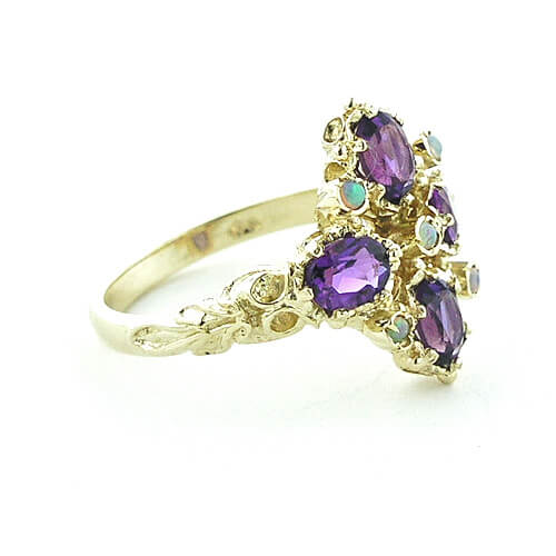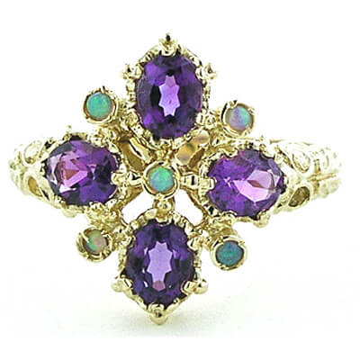 A beautiful Antique Style 9ct Yellow Gold Amethyst & Opal Ring set with five small 2mm (0.08″ inches) Fiery Opals & four 5x4mm (0.20″x0.16″ inches) vibrant Amethysts in an stunning 9ct Gold setting.