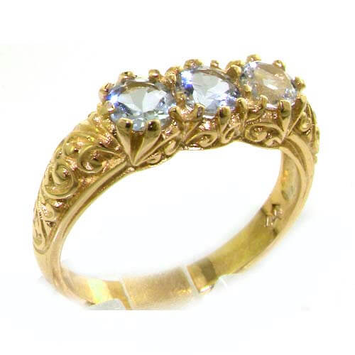 Our stunning ornate trilogy design inspired by the Victorian era, made in 9ct yellow gold and handset with natural aquamarines each measuring 4.5mm (0.18? inches)