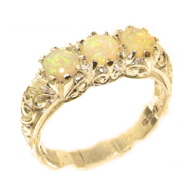 Our stunning ornate trilogy design inspired by the Victorian era, made in 9ct yellow gold and handset with beautiful Australian opals, each measuring 4.5mm (0.18? inches)