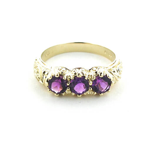 Our stunning ornate trilogy design inspired by the Victorian era, made in 9ct Yellow Gold and handset with natural amethysts each measuring 4.5mm (0.18? inches)