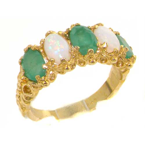 This ring is a real Beauty: it is graced by five wonderful Emeralds & Opals measuring 6×4 mm (0.24″ x 0.9.4aaa6″) set in this 14ct Gold Antique style setting.