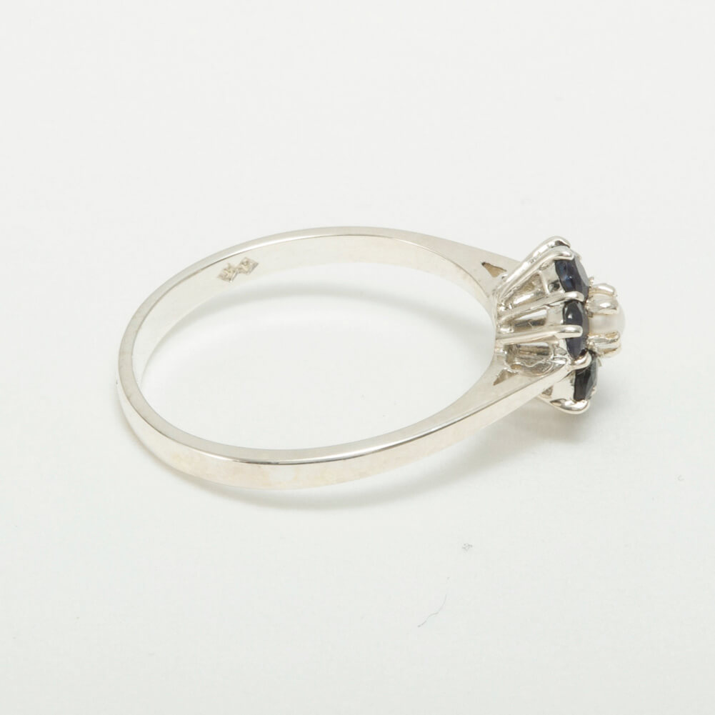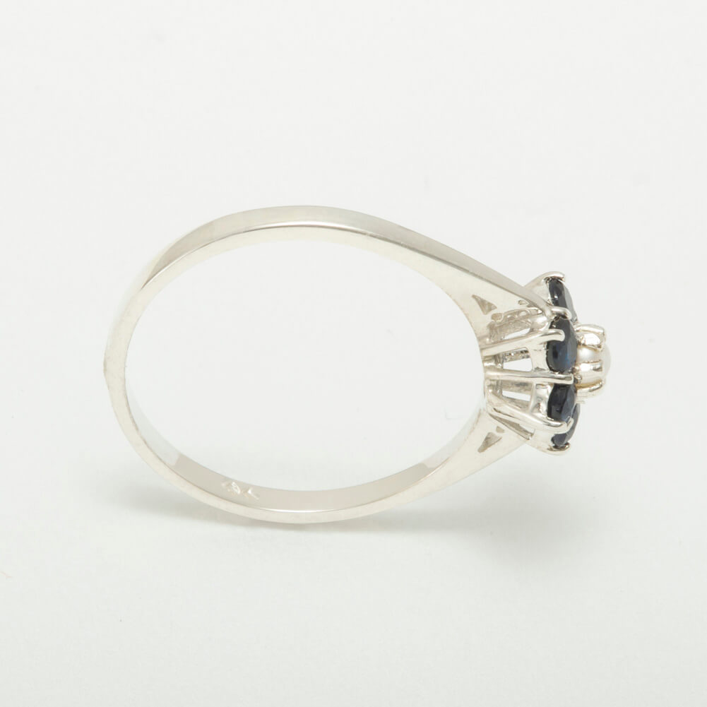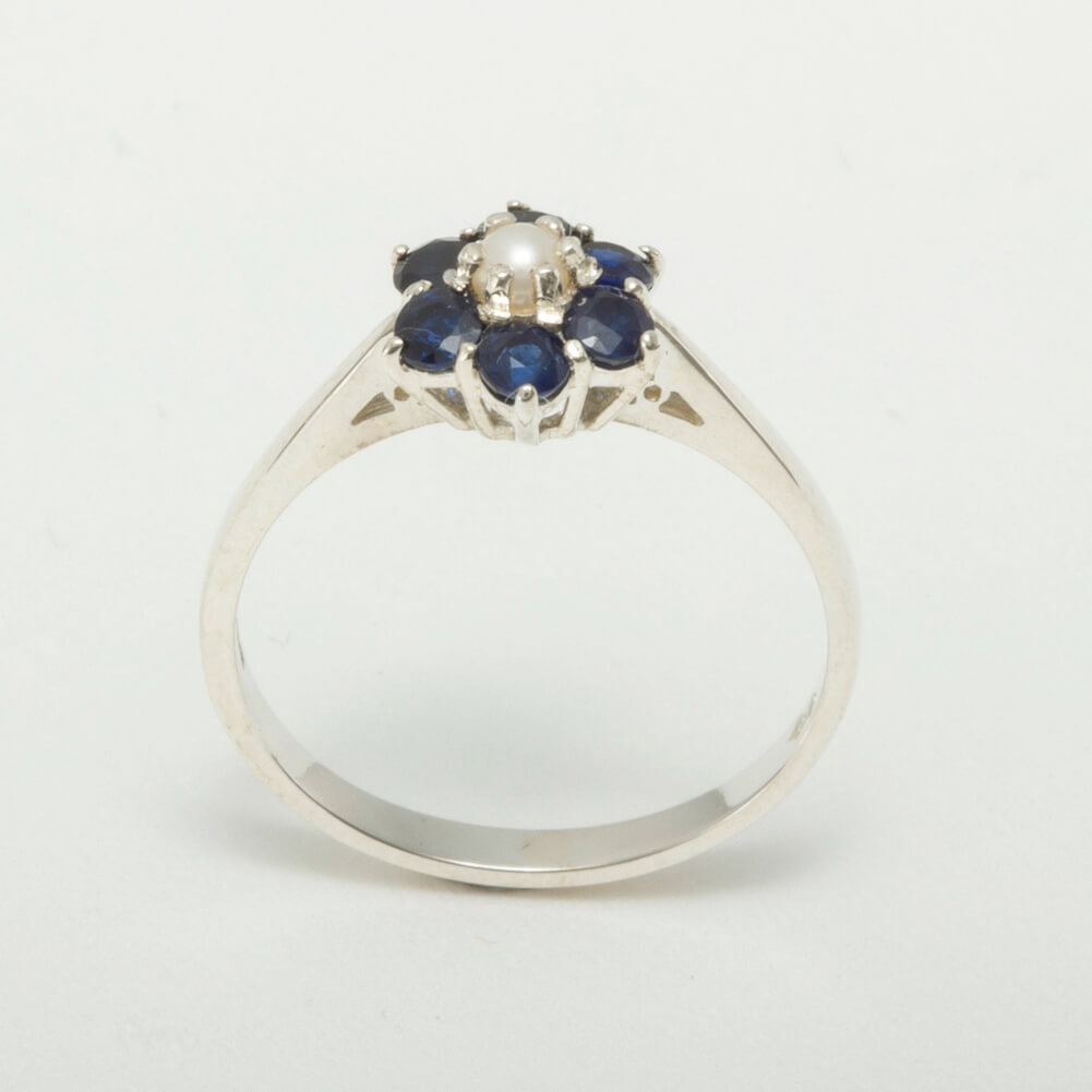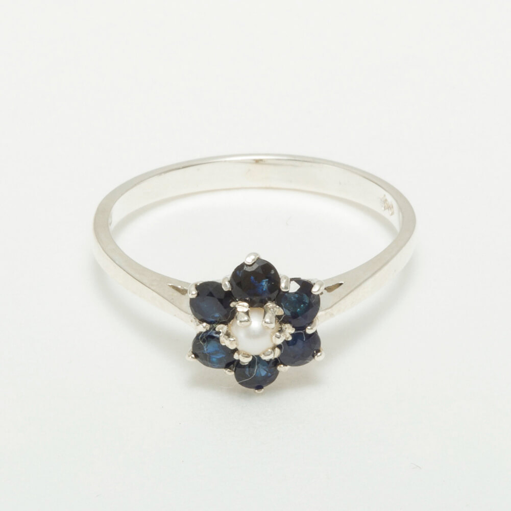 This Delightful ring has been set with a center 2.75mm (0.11″ inches) lustrous Cultured Pearl and surrounded by six 2.6mm (0.10″ inches) dark midnight blue Sapphires which look fabulous set against the Polished Silver. These gemstones have been hand set in this luxury Solid Sterling Silver Cluster setting. All the Gemstones have been set by hand using traditional methods, by our expert Jeweler.