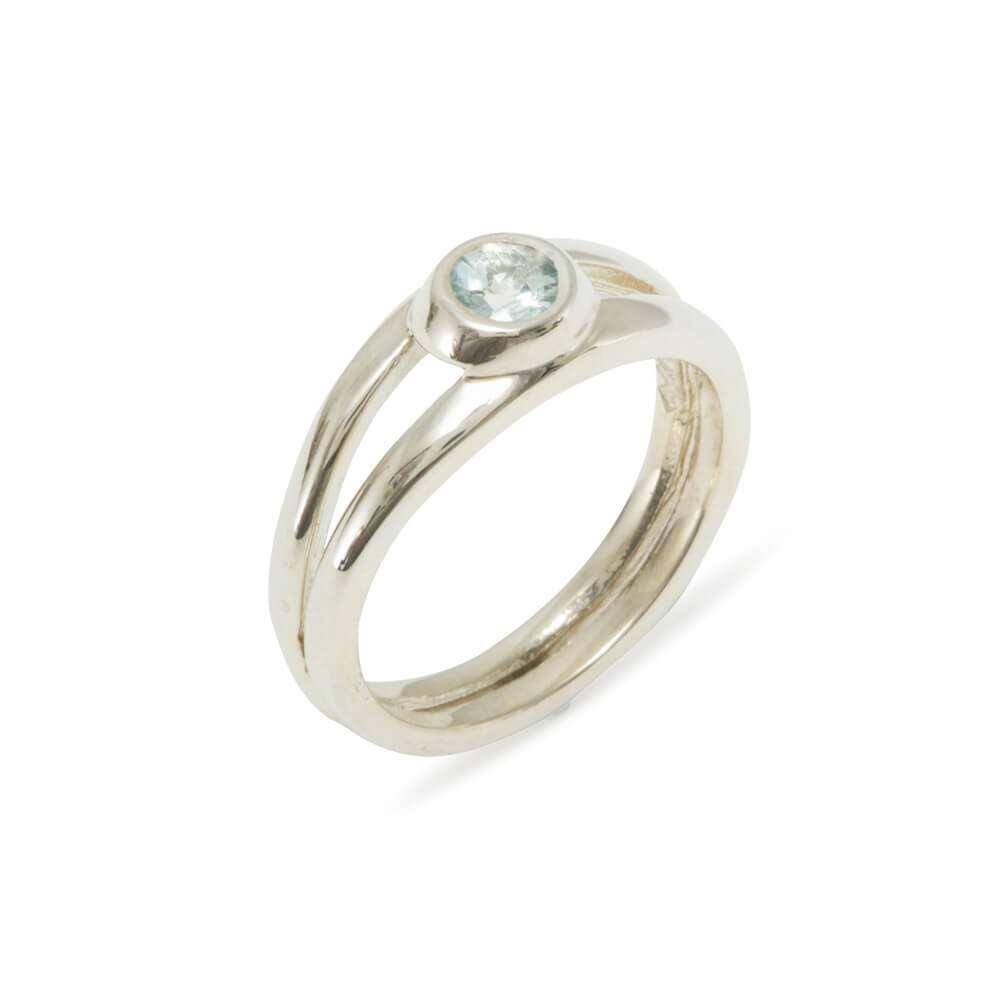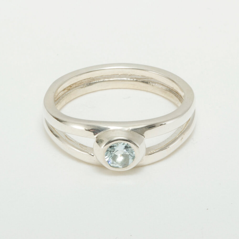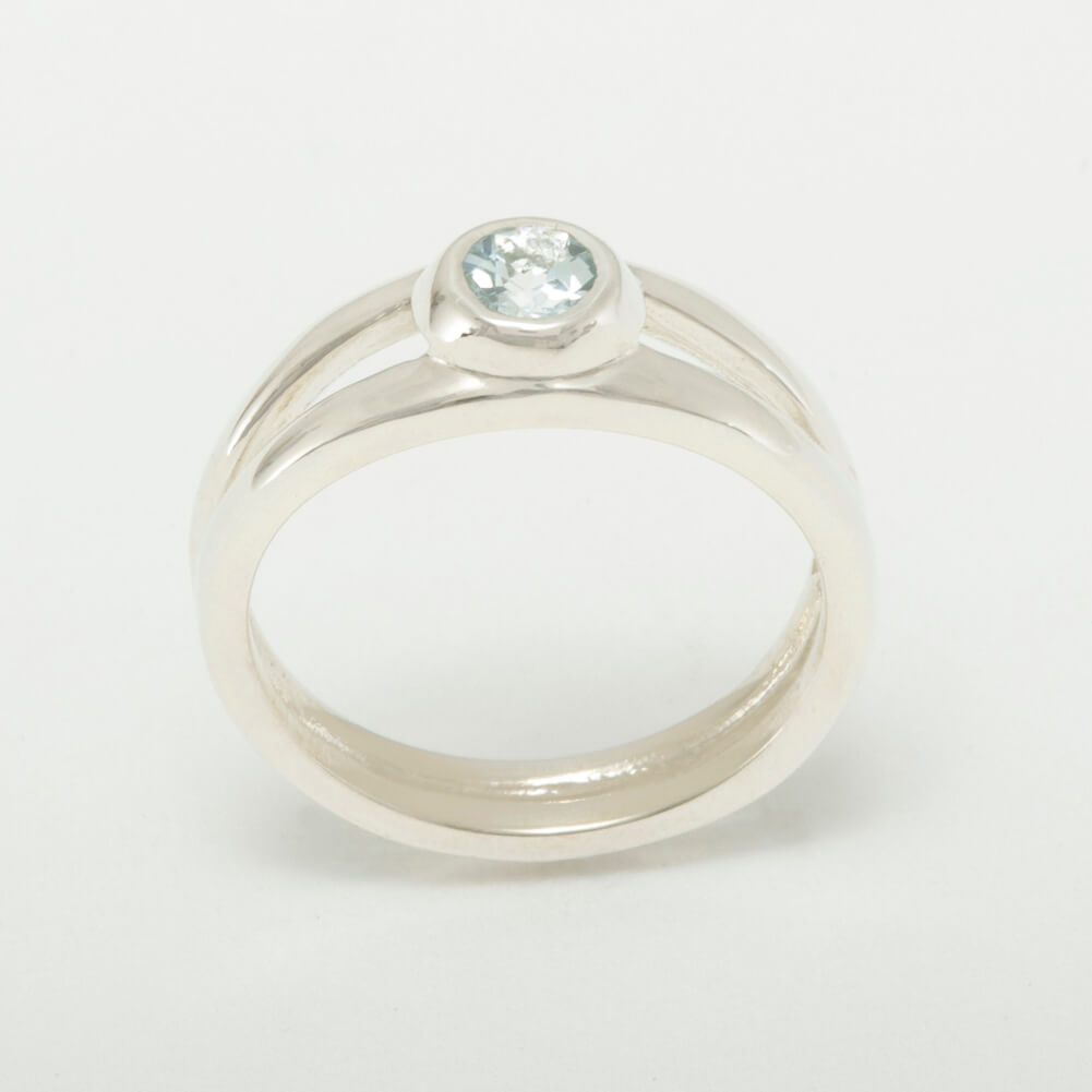 One round cut 3.75mm (0.15″ inches) ice blue Aquamarine set in this Solid Sterling Silver modern Solitaire band setting.
