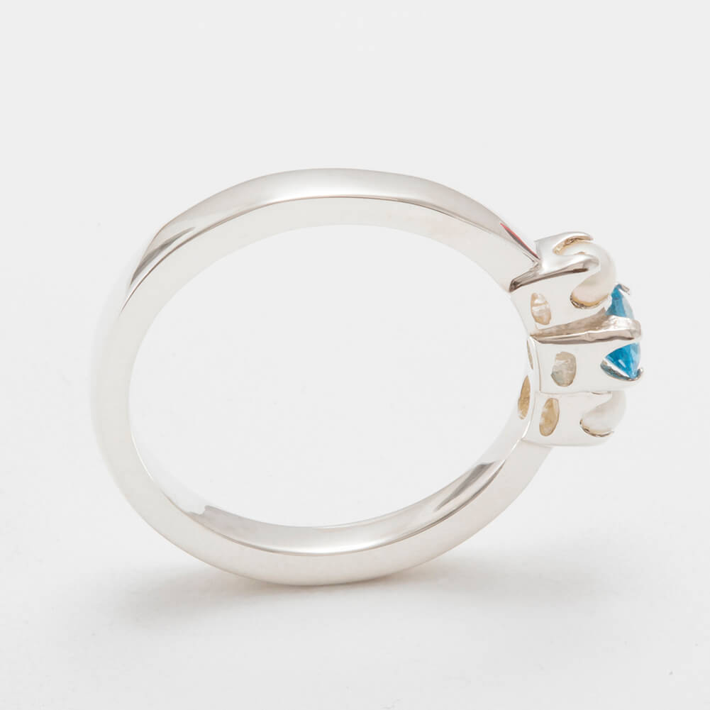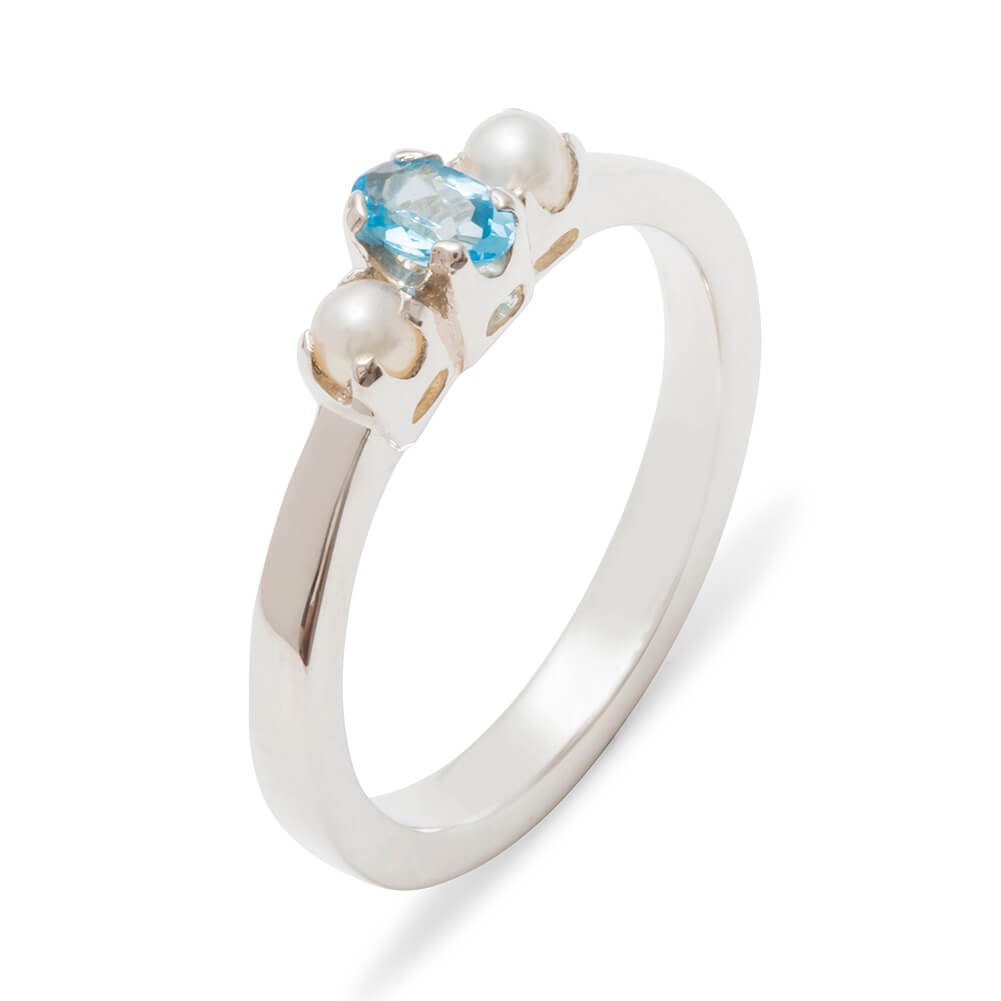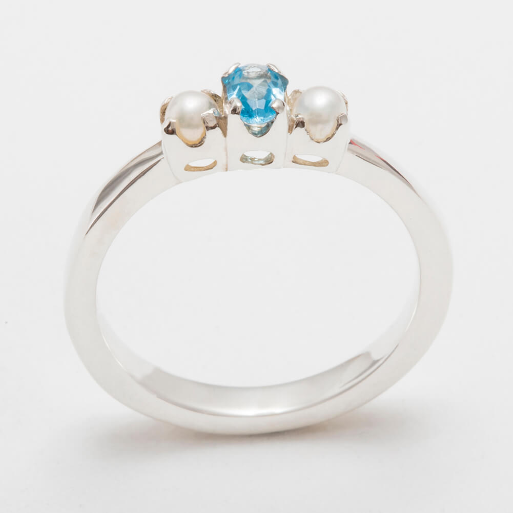 A Wonderfully simple trilogy ring with a super thick shank. One Blue Topaz & two Cultured Pearls all held securely in place with 4 claws each, the Blue Topaz measures 5x3mm oval (0.2″x0.12″) and the Cultured Pearls are approx 2.75mm (0.11″). The Topaz & Cultured Pearls have been individually selected for this ring by expert Jewellers to ensure they are a good match. The Vibrant Blue of the Topaz compliments wonderfully the satin sheen of the cultured Pearls