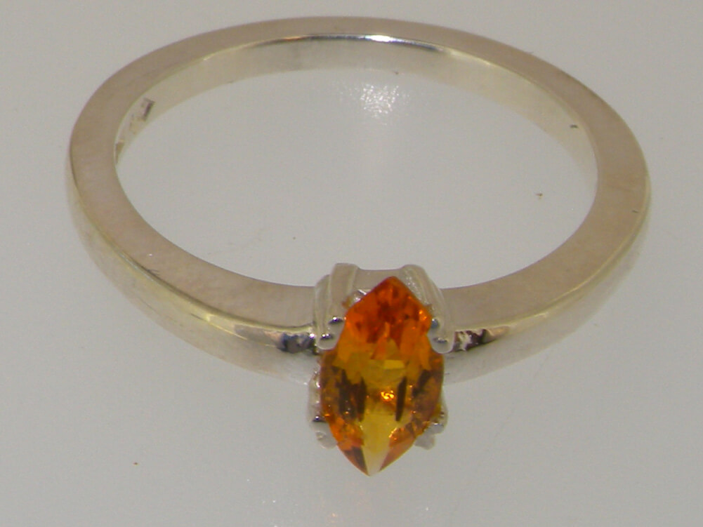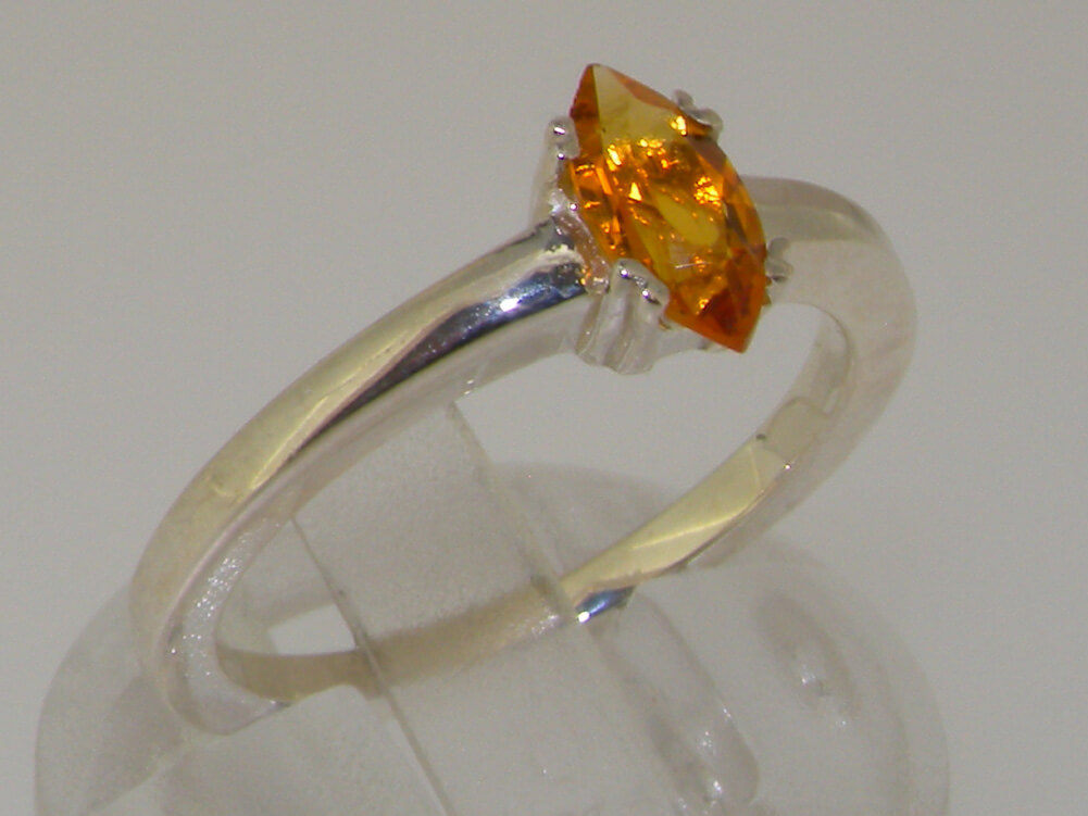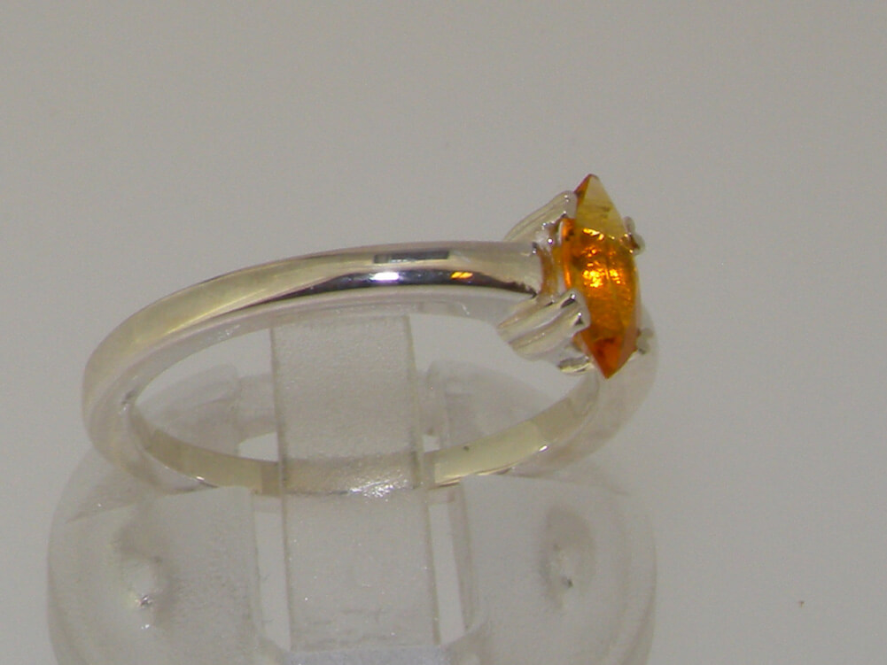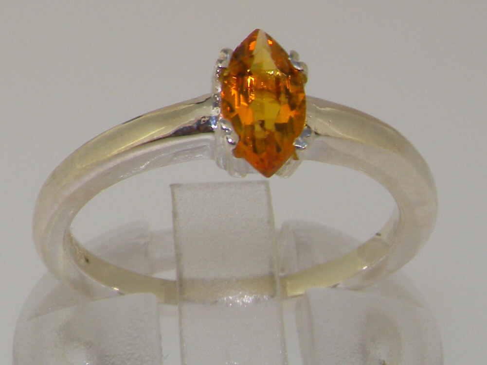 A Solid Silver Marquise Solitaire ring set with an 8x4mm (0.24″x0.16″) Marquise cut Citrine. This natural Citrine gemstone has a Vibrant Golden Honey colour and is securely held in place by 4 claws, hand set by an expert jeweller.