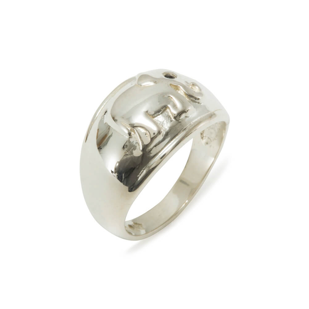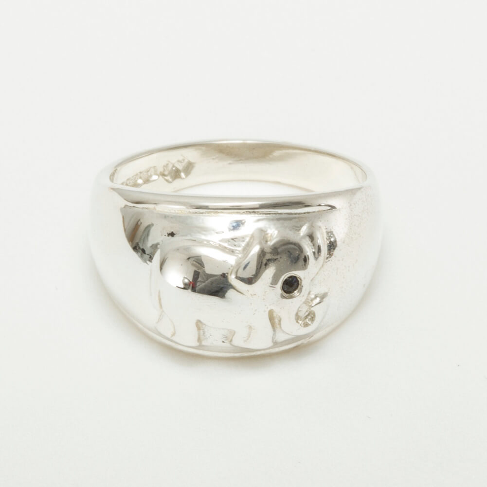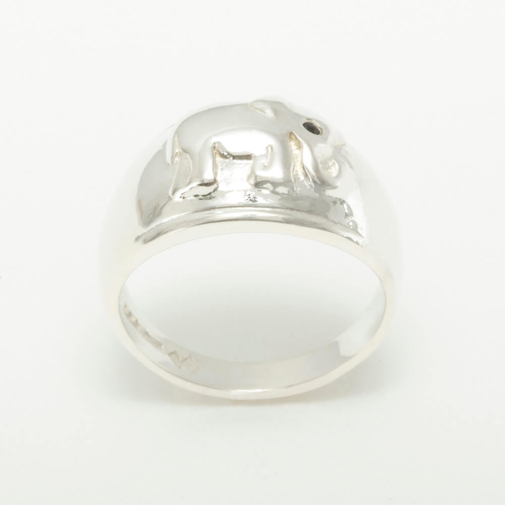One small round cut 1mm (0.04″ inches) Sapphire set in this Solid Sterling Silver modern Solitaire band setting with an Elephant design.