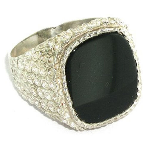This solid chunky Sterling Silver mount has been made to a very high standard and weighs in at 7.5 grams. As you can see from the pictures the shank of this ring is thick and solid all the way round. The shoulders of the ring have an unusual design. This ring is a real eye-catcher and therefore a ring you can give or wear with pride & confidence.The Onyx measures 16x14mm.
